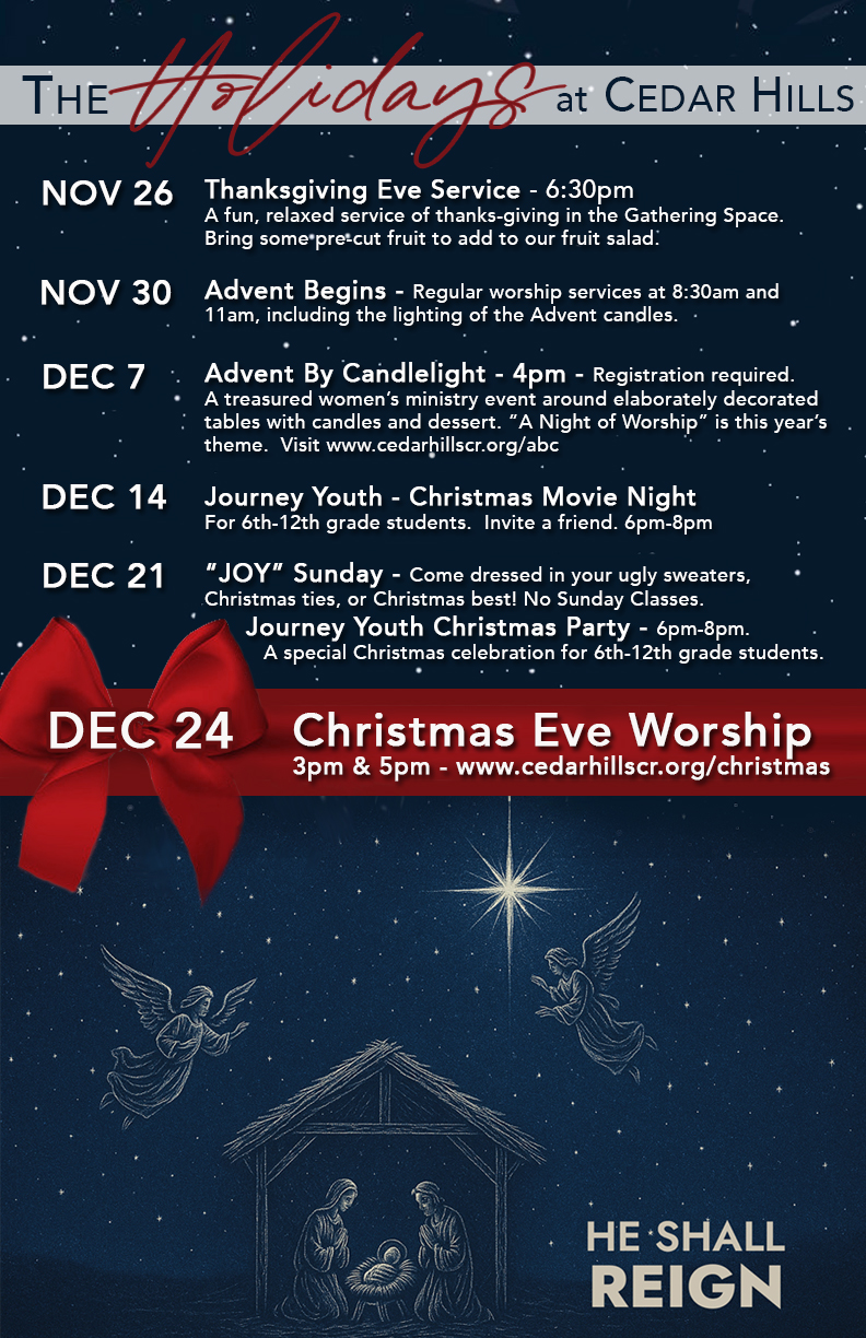 ADVENT BY CANDLELIGHT – Join the women of Cedar Hills with a special presentation of “A Night of Worship” at Advent By Candlelight. Enjoy beautifully decorated tables, worship, guest speaker, reflection, and connection as we prepare our hearts for the season of Advent. If you feel led to host a table for this special evening, we’d love to have you! Simply stop by the table in the Gathering Space to learn more or express your interest. Registration is highly encouraged so we can save you a seat! Please register to attend online or sign-up at the table in the Gathering Space. REGISTER NOW