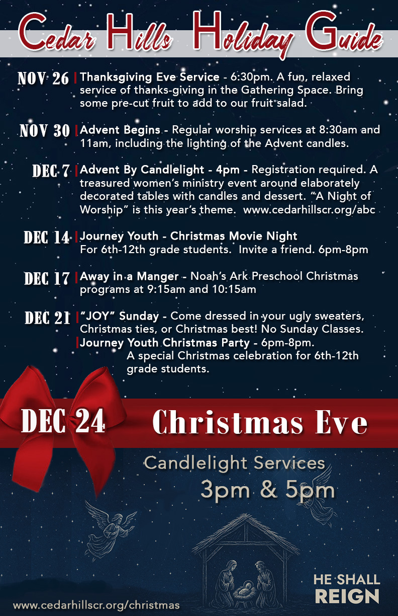 ADVENT BY CANDLELIGHT – Join the women of Cedar Hills with a special presentation of “A Night of Worship” at Advent By Candlelight. Enjoy beautifully decorated tables, worship, guest speaker, reflection, and connection as we prepare our hearts for the season of Advent. If you feel led to host a table for this special evening, we’d love to have you! Simply stop by the table in the Gathering Space to learn more or express your interest. Registration is highly encouraged so we can save you a seat! Please register to attend online or sign-up at the table in the Gathering Space. REGISTER NOW